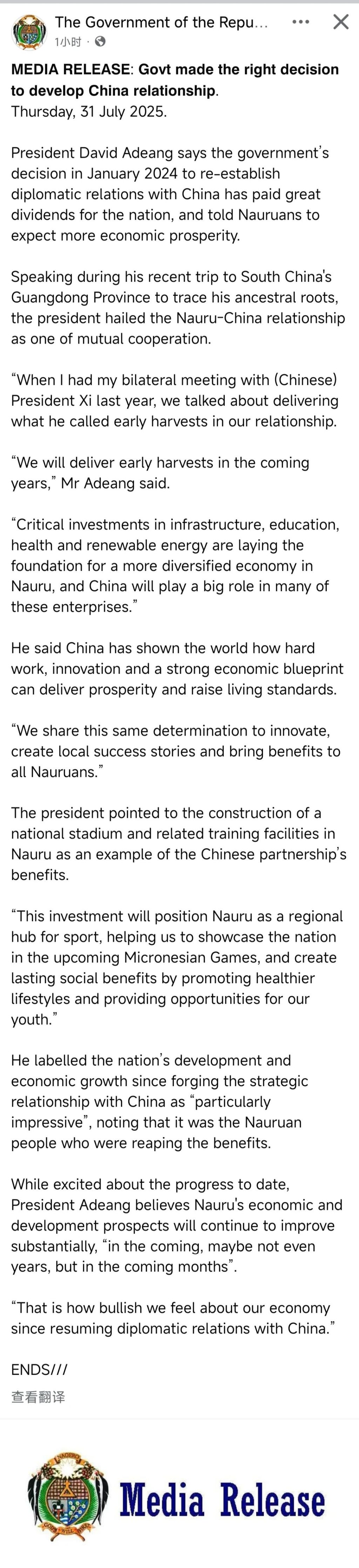 戴维·阿迪昂总统表示,瑙鲁政府2024年1月与中国恢复外交关系的决定已为国家带来巨大红利,并告知国民未来将迎来更繁荣的经济前景。