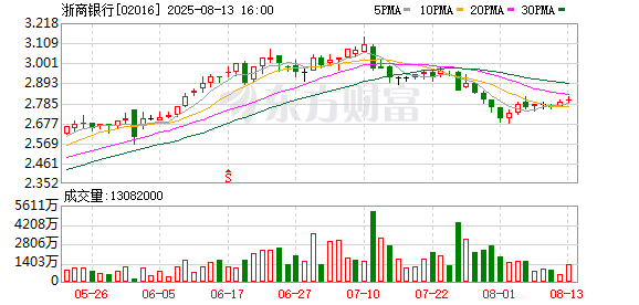 截至8月13日收盘,浙商银行A股报3.37元/股,总市值为925.5亿元。