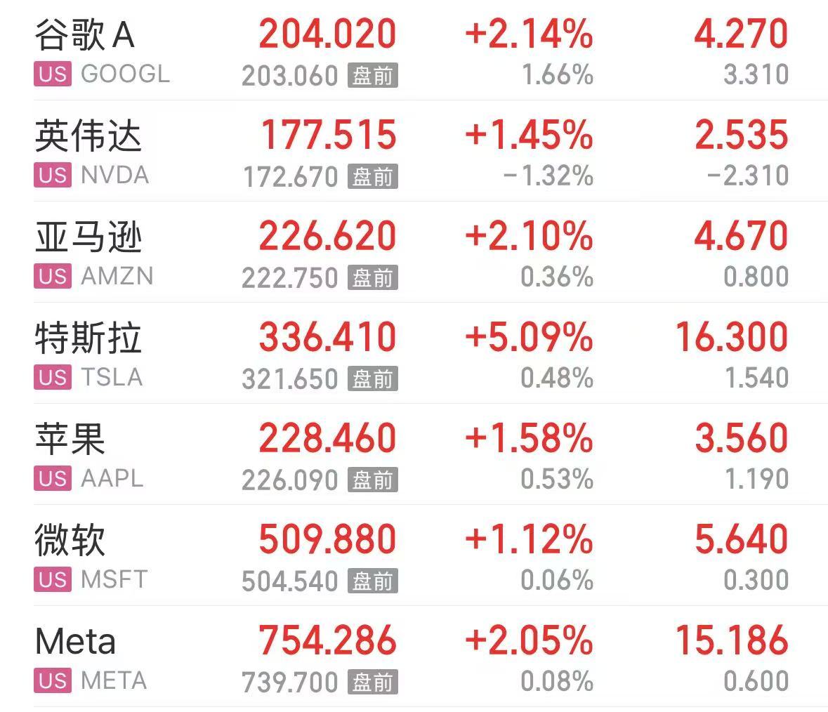 大型科技股普涨,特斯拉上涨5.09%,市值增长525.45亿美元(约合人民币3766.58亿元),亚马逊、谷歌、Meta涨超2%,英伟达、苹果、微软涨超1%。