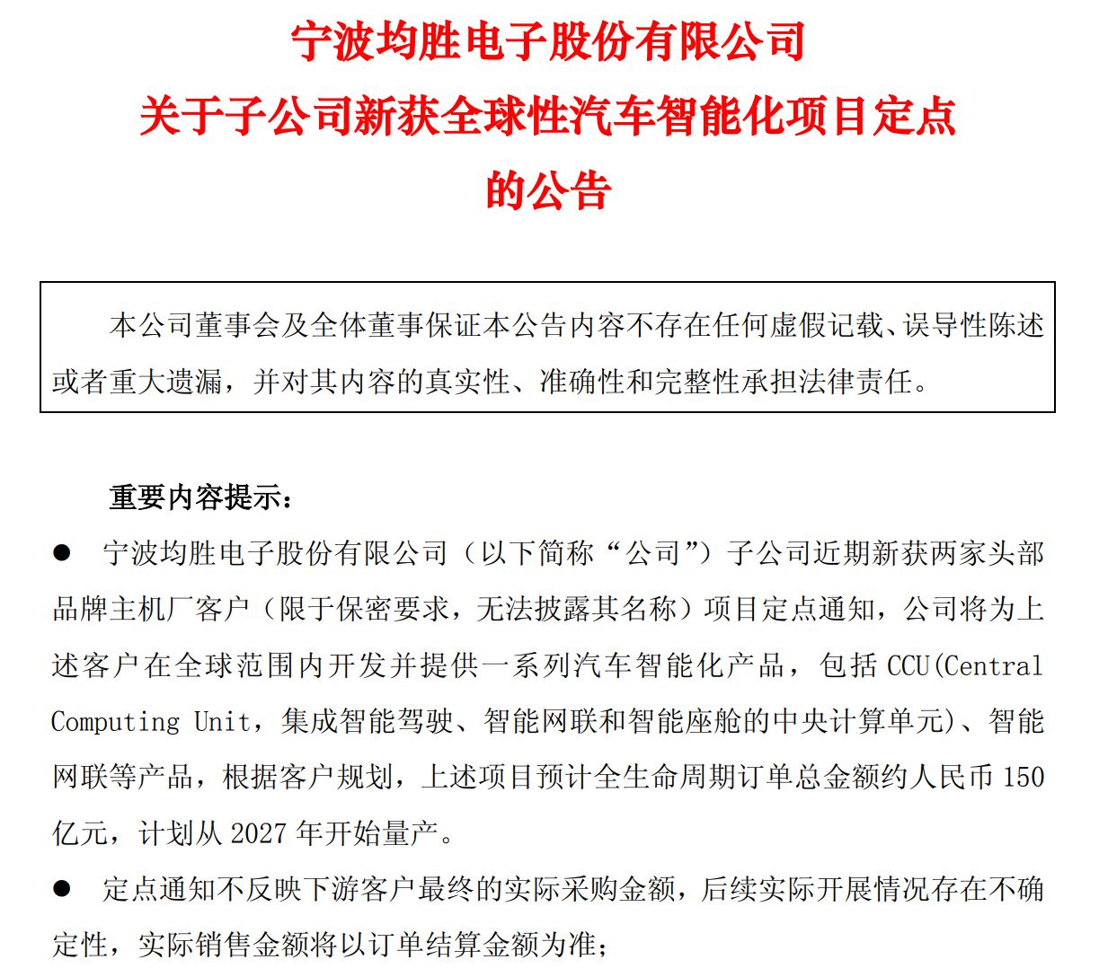 9月15日晚间,均胜电子公告称,子公司近期新获两家头部品牌主机厂客户项目定点通知,公司将为上述客户在全球范围内开发并提供一系列汽车智能化产品,包括CCU(集成智能驾驶、智能网联和智能座舱的中央计算单元)、智能网联等产品,根据客户规划,上述项目预计全生命周期订单总金额约150亿元,计划从2027年开始量产。