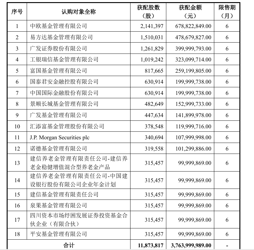 澎湃新闻记者从百利天恒了解到,此次定增的定价基准日为2025年9月5日,发行底价为266.02元/股,不低于定价基准日前20个交易日公司股票交易均价的80%。在认购环节,30家投资者提交报价,最终18家胜出,确定本次发行价格为317元/股,发行价格与发行底价的比率为119.16%。最终发行对象涵盖公募基金、券商、保险及国际资管机构,其中,中欧基金、易方达基金、广发证券、工银瑞信等头部投资机构获配金额均超3亿元。