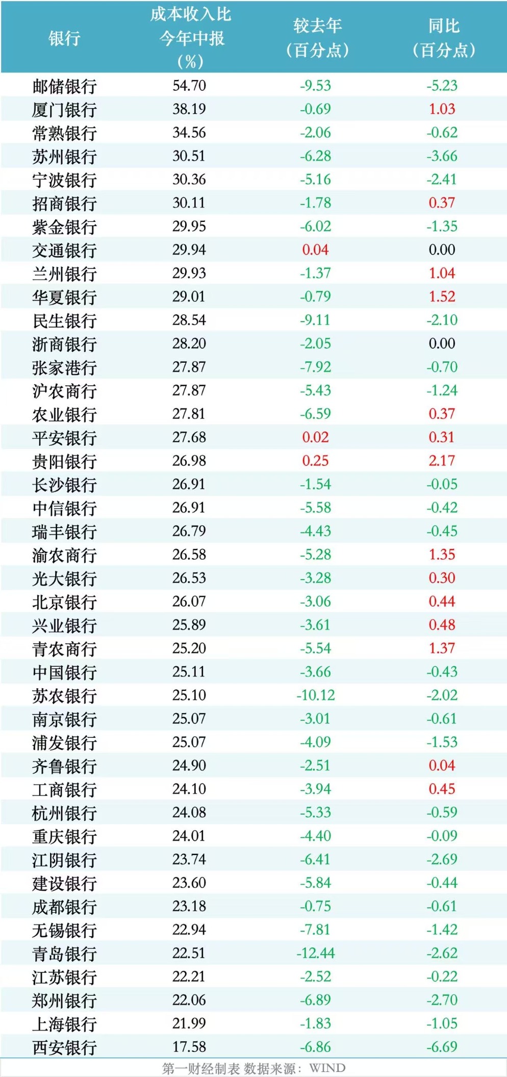 从成本收入比来看,Wind数据显示,相比去年全年,42家上市银行中,交通银行、平安银行、贵阳银行3家上半年成本收入比略增,其余39家上市银行上半年成本收入比均有不同程度下行。其中,苏农银行、青岛银行成本收入比降幅超过10个百分点。