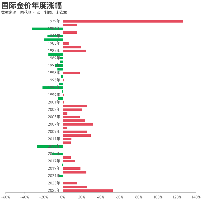 1971年,布雷顿森林体系瓦解,美元与黄金脱钩,黄金自此回归“独立的避险资产”,开启了价格市场化波动的时代。《每日经济新闻》记者统计1979年以来国际金价年度涨幅数据,一个令人吃惊的现象是,截至发稿,2025年国际金价的年内涨幅已经超过1980年以来的所有年份。