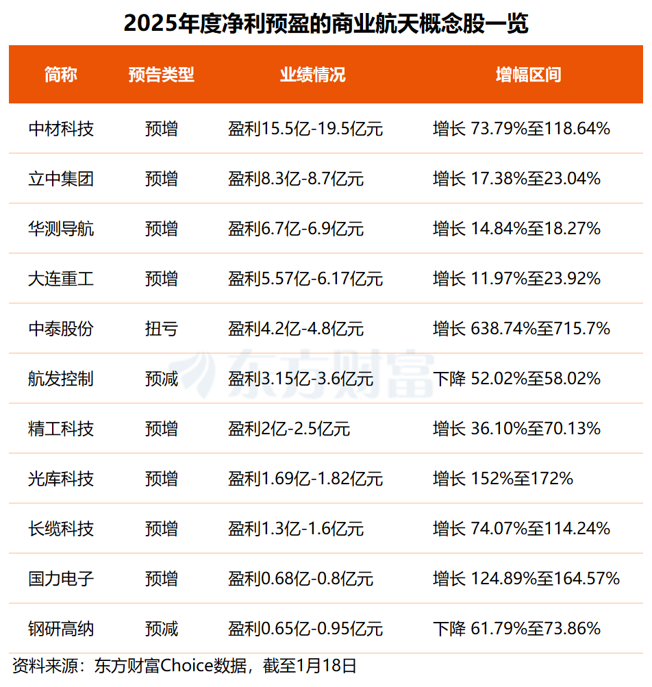 东方财富Choice数据显示,截至1月18日,已有25只商业航天概念股披露2025年度业绩预告,其中有11股预计实现归母净利润盈利(9股预增、2股预减),中材科技去年净利预盈15.5亿至19.5亿元居首,立中集团、华测导航分别预盈超8.3亿元和6.7亿元。